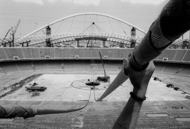 Assemblaggio dei componenti della struttura di copertura dello Stadio Olimpico di Atene.
